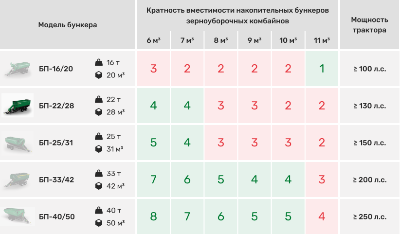 Вмещает до 4-х бункеров комбайнов с объемом 6 м3, 3 или 4 бункера комбайна с объемом 7 м3. Производительность выгрузки - 450/600 т/час. Мощность трактора - 130-150 л.с.